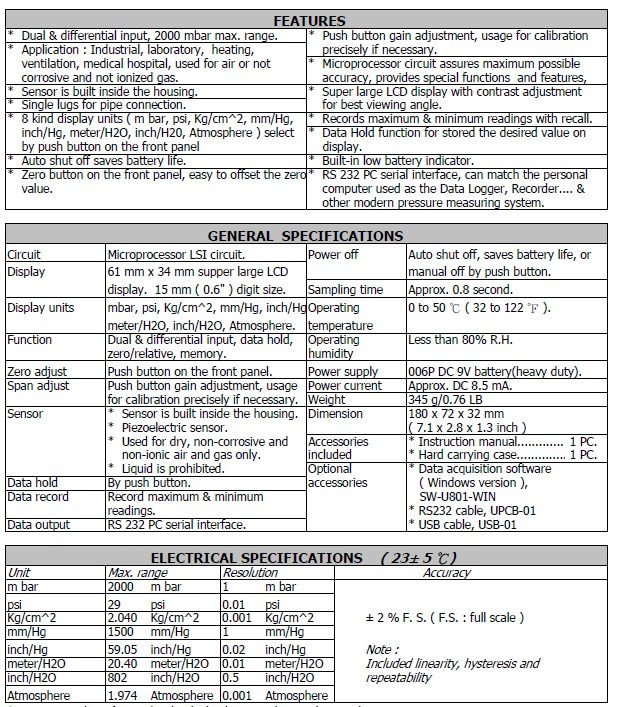 Description MANOMETER, 2000 mbar, differential input