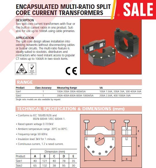 The split-core design allows installation into existing networks without disconnecting cables or busbar circuits. The multi-ratio feature is ideally suited to stockists, distributors and contractors who need instant access to popular CT ratios up to 1000A in two stock items.