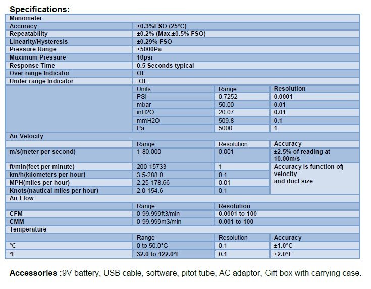 Accessories :9V battery, USB cable, software, pitot tube, AC adaptor, Gift box with carrying case