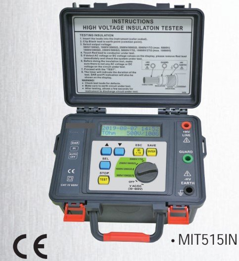 • 2 Lines × 16 Characters LCD • Microprocessor-controlled • Tests insulation resistance up to 1 TΩ • 4 Insulation test voltages: 500V, 1000V, 2500V, 5000V • AC / DC Voltmeter (30~600V) • Short-circuit current up to 5mA • PI (Polarization Index) indication • DAR (Dielectric Absorption Ratio) indication • Auto-ranging on all insulation ranges • Auto-hold function to freeze reading • Overload protection • Adjustable testing duration: 1~30 minutes • Internal memory for data storage • Displays testing duration for insulation measurement • Auto-off function • 200 measurement results can be saved in memory and recalled on display
