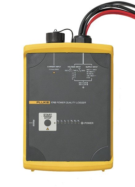 Fluke 1743: IP65 water-proof monitor for logging the most common power parameters including V, A, W, VA, VAR, PF, energy, flicker, voltage events, and THD.