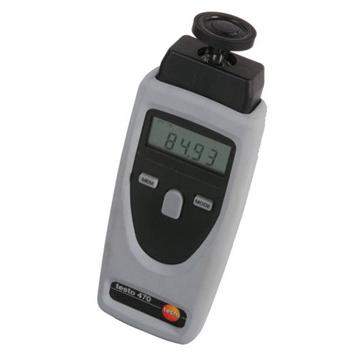 Testo 470 Tachometer, the ideal combination of optical and mechanical rpm measurement. It can be used as a non-contact Optical meter by simply attaching a reflector to the object to be measured, point the visible, red light beam at the reflector and measuring.