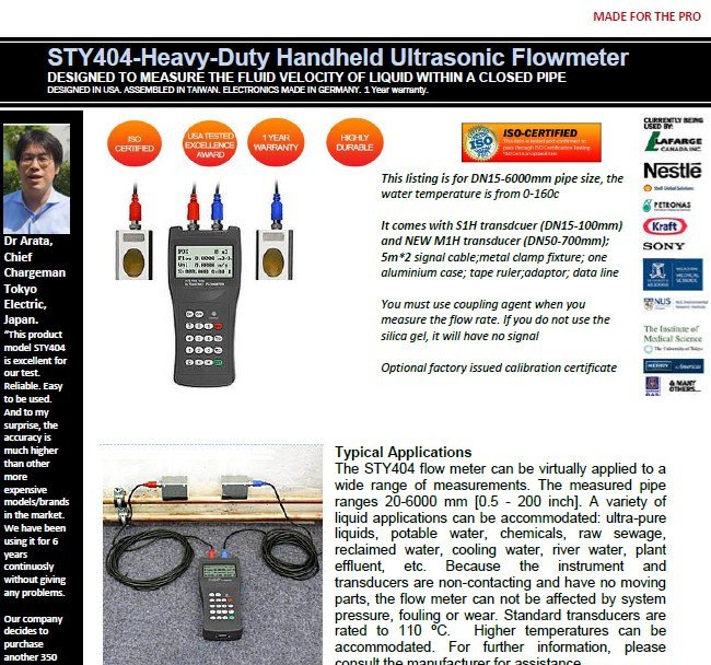 The STY404 flow meter can be virtually applied to a wide range of measurements. The measured pipe ranges 20-6000 mm [0.5 - 200 inch]. A variety of liquid applications can be accommodated: ultra-pure liquids, potable water, chemicals, raw sewage, reclaimed water, cooling water, river water, plant effluent, etc. Because the instrument and transducers are non-contacting and have no moving parts, the flow meter can not be affected by system pressure, fouling or wear. Standard transducers are rated to 110 ºC. Higher temperatures can be accommodated. For further information, please consult the manufacturer for assistance.