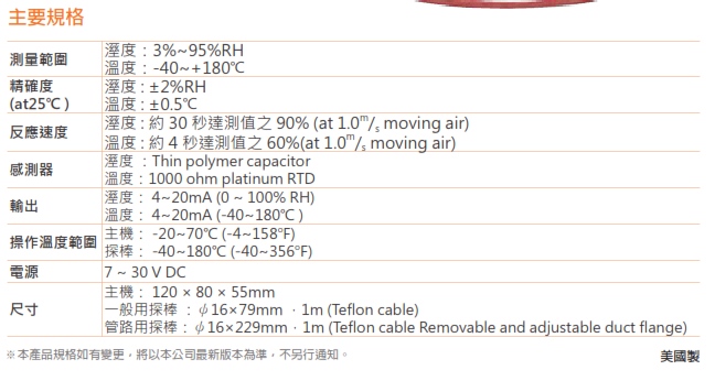 RH/Temp transmitter( -40degc~+180degc) for control/monitoring purpose. A very robust sensor(w/ transmitter) for high temperature environment. Made in USA.